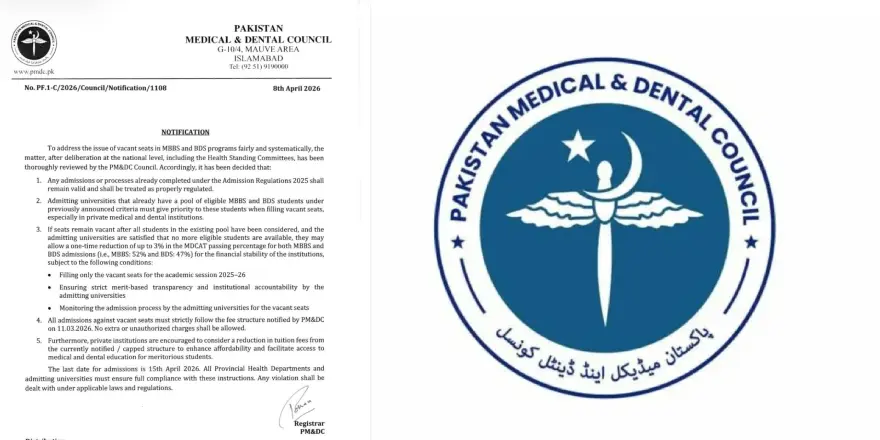 کونسل نے نجی اداروں کو مزید فیس کم کرنے پر غور کرنے کی ہدایت بھی کی ہے تاکہ زیادہ سے زیادہ طلبہ کو طبی تعلیم تک رسائی دی جا سکے، جبکہ داخلوں کی آخری تاریخ 15 اپریل 2026 مقرر کی گئی ہے اور خلاف ورزی کی صورت میں کارروائی کا انتباہ بھی جاری کیا گیا ہے۔