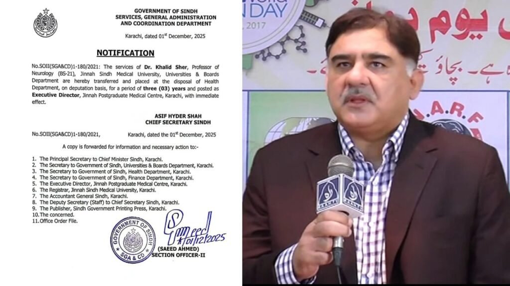 کراچی: حکومتِ سندھ نے سینئر نیورولوجسٹ اور جناح سندھ میڈیکل یونیورسٹی کے پروفیسر ڈاکٹر خالد شیر کی خدمات کو فوری طور پر ہیلتھ ڈیپارٹمنٹ کے حوالے کرتے ہوئے انہیں جناح پوسٹ گریجویٹ میڈیکل سینٹر کا ایگزیکٹو ڈائریکٹر مقرر کردیا ہے۔ محکمہ سروسز، جنرل ایڈمنسٹریشن اینڈ کوآرڈینیشن ڈیپارٹمنٹ کی جانب سے جاری نوٹیفکیشن کے مطابق، ڈاکٹر […]